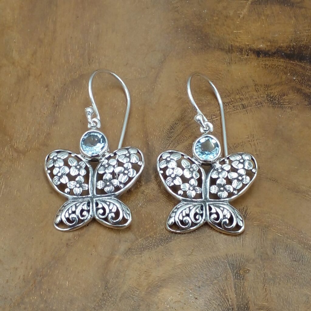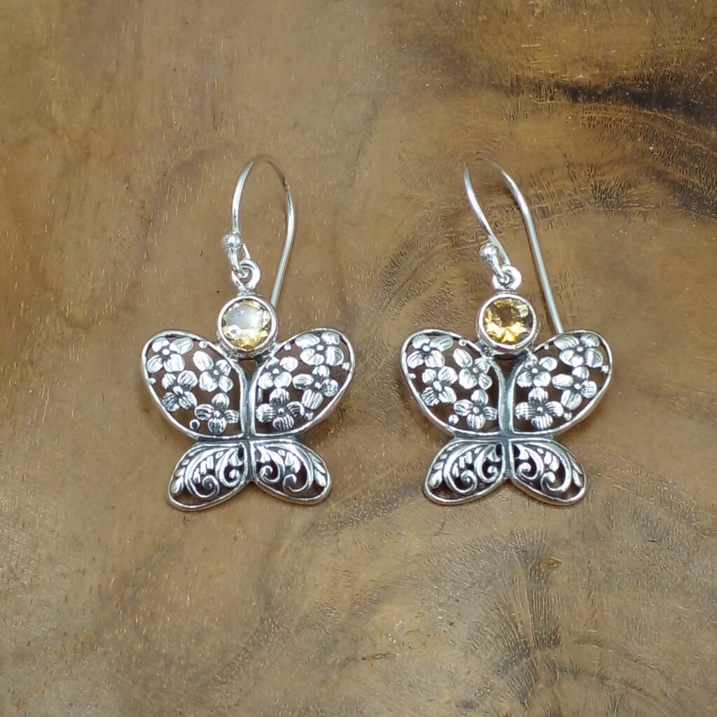 Tampilkan pesona anggun dan artistik lewat Anting Perak Kupu-Kupu Bali, perpaduan sempurna antara keindahan alam dan seni kerajinan Bali. Anting ini menampilkan bentuk kupu-kupu dengan motif bunga-bunga yang cantik dan ukiran khas Bali pada sayapnya. Serta dihiasi permata berkilau yang menambah kesan mewah dan feminin.