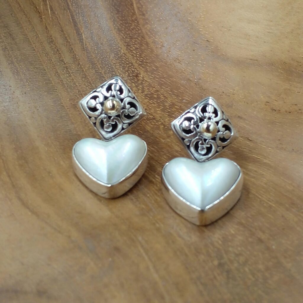 Tampilkan pesona alami dengan Anting Perak Tusuk Mutiara Mabe, perhiasan elegan yang menggabungkan keindahan mutiara mabe asli dengan perak sterling 925. Desain tusuk yang simpel dipadukan dengan box perak berbentuk wajik bermotif ukiran khas Bali. Dan kombinasi mutiara mabe berbentuk hati memberi kesan mewah namun tetap natural serta sentuhan kilau emas 18 karat menjadikan anting ini semakin menawan.