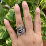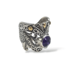 Spesifikasi Produk:Metal: Perak 92.5%Permata: Amethyst & Green Amethyst (RD, 8 mm)Emas: 18KPanjang: 21 mm (front part)Lebar: 20 mm (front part) Lebar gagang: 3 mmBerat: 8.5 gr (Size 7)