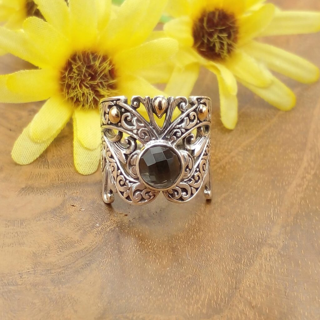 Ciptakan sentuhan elegan dan etnik pada penampilan Anda dengan Cincin Perak Ukiran (Bun) Bali. Terbuat dari perak berkualitas tinggi dan didesain dengan detail ukiran motif khas Bali yang artistik dan rumit. Cincin ini juga dihias dengan permata asli pilihan serta emas 18 karat, memberikan kesan mewah sekaligus nilai budaya. Cocok digunakan sebagai aksesori harian maupun pelengkap gaya boho dan etnik, cincin ini juga ideal sebagai hadiah spesial bagi orang tersayang.