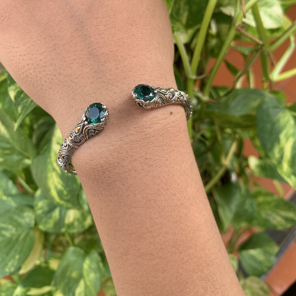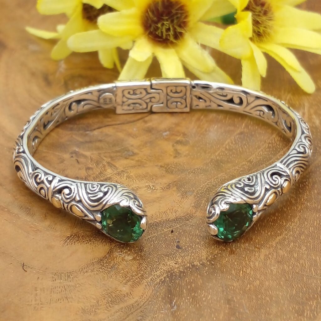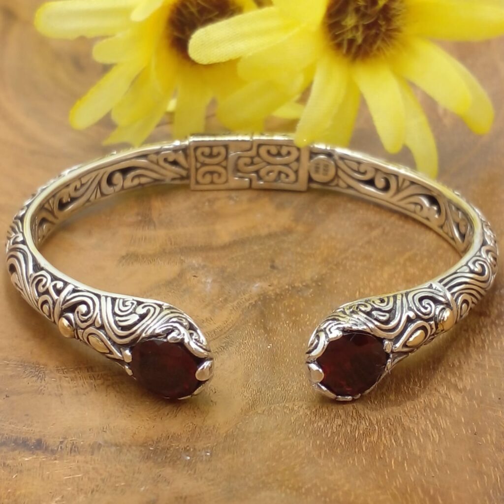 Spesifikasi Produk:Metal: Perak 92.5%Emas: 18KPermata: Citrine/ Garnet/ Green Quartz (Rd, 8 mm)Panjang: 182 mm (inner circum 6.75”)Lebar: 9 mmDiameter: 56 mmBerat: 22.7 gr