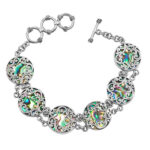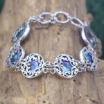 Spesifikasi Produk:Metal: Perak 92.5%Emas: 18KKerang: Abalone (paua) (Rd, 17 mm)Panjang: 180 mm (Size 7”) (exclude extention ring)Lebar: 17.5 mmBerat: 19.2 gr