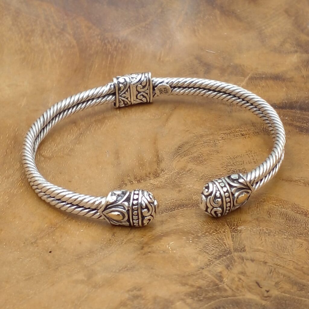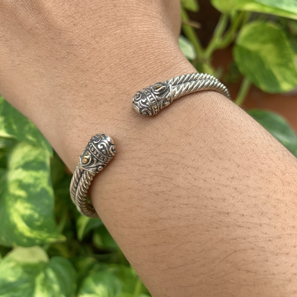 Tampilkan gaya yang khas dan berkelas dengan Gelang Perak Cable Bali, perhiasan istimewa yang menggabungkan keanggunan desain tradisional Bali dengan keindahan material perak murni. Kombinasi cable atau tali kawat yang kuat, dipadukan dengan ukiran khas Bali yang artistik, serta sentuhan emas 18 karat mencerminkan kemewahan.