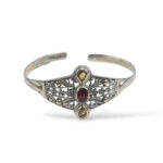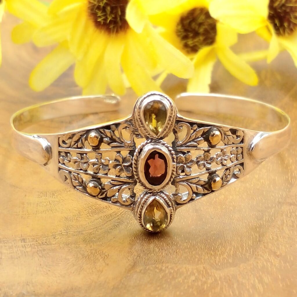 Spesifikasi Produk:Metal: Perak 92.5%Permata: Garnet (Ov 5×7 mm) & Citrine (Ps 4×6 mm)Emas: 18KPanjang: 158 mm (end to end)Lebar: 19 mmBerat: 10.8 gr