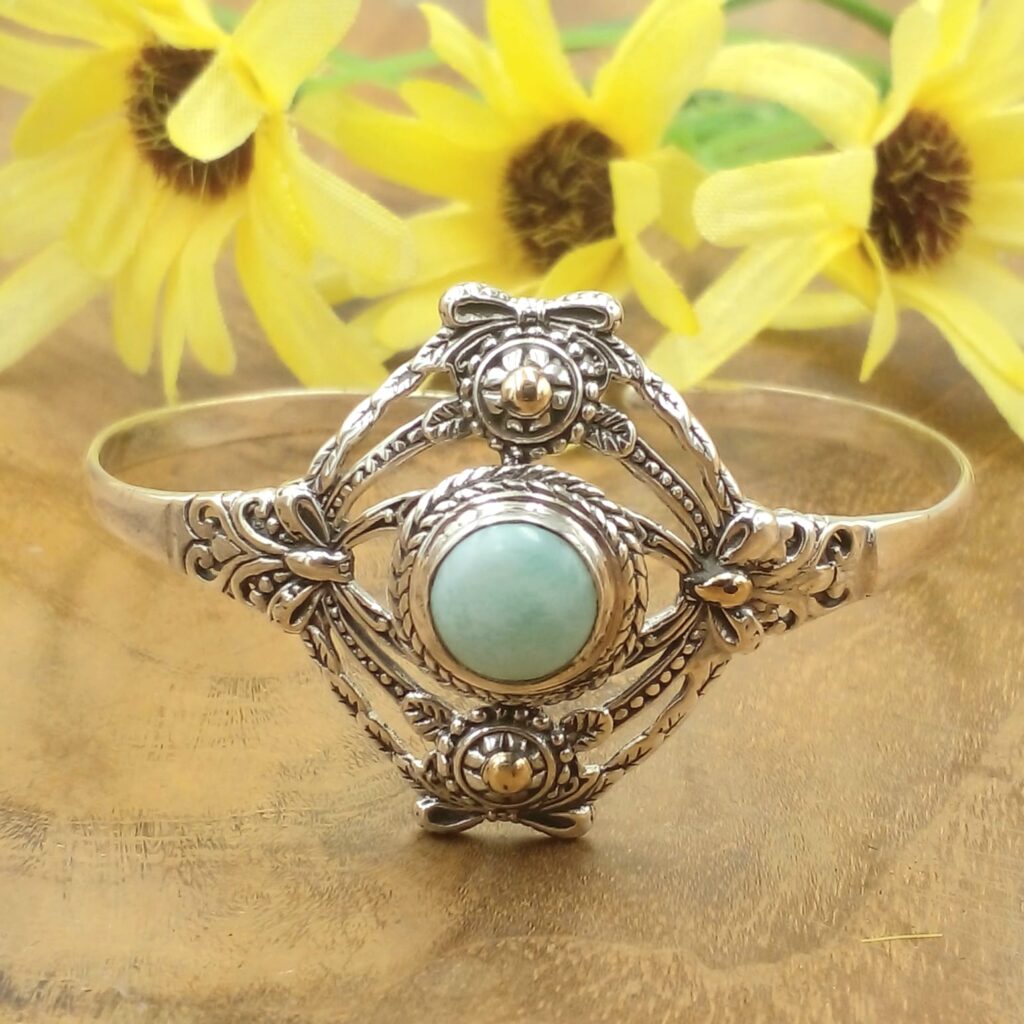 Spesifikasi Produk:Metal: Perak 92.5%Permata: Green Quartz/ Larimar (Rd 8 mm)Emas: 18KPanjang: 160 mm (end to end)Lebar: 30 mmBerat: 10.9 gr
