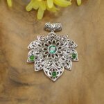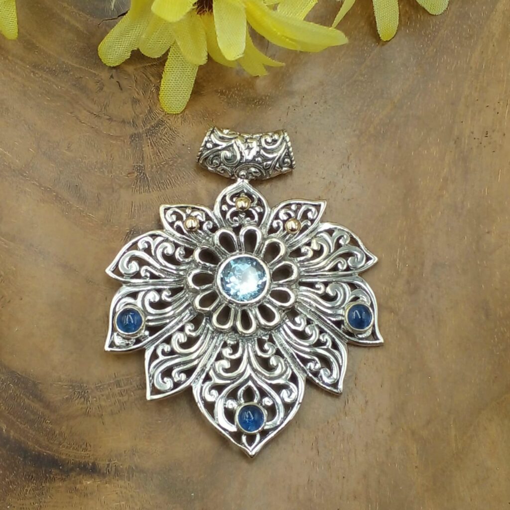 Spesifikasi Produk:Metal: Perak 92.5%Permata: Blue Topaz, Garnet, Green Quartz, Peridot, Turquoise, Blue Stone & Green StoneEmas: 18KPanjang: 56 mmLebar: 48 mmBerat: 14.1 gr