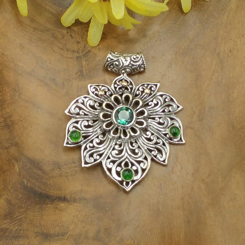Liontin Bunga Perak Bali adalah perhiasan cantik yang memadukan keanggunan bunga dengan kehalusan kerajinan perak khas Bali. Dibuat oleh pengrajin lokal, liontin ini menampilkan motif bunga yang anggun dan artistik, merefleksikan keindahan alam tropis dan budaya Bali yang kaya. Kombinasi kilau permata asli dan emas 18 karat menjadikan liontin ini semakin memukau.