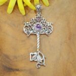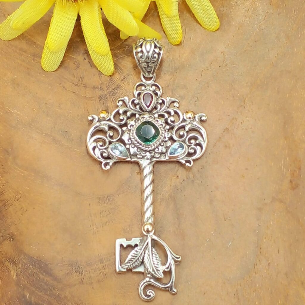Pancarkan keanggunan dengan Liontin Kunci Perak Bali yang memikat. Dirancang dengan bentuk kunci —lambang harapan, misteri, dan awal baru. Liontin ini dihias dengan sentuhan seni ukir khas Bali, permata berkilau dan emas 18 karat, menampilkan kemewahan yang elegan dan bernuansa etnik.