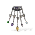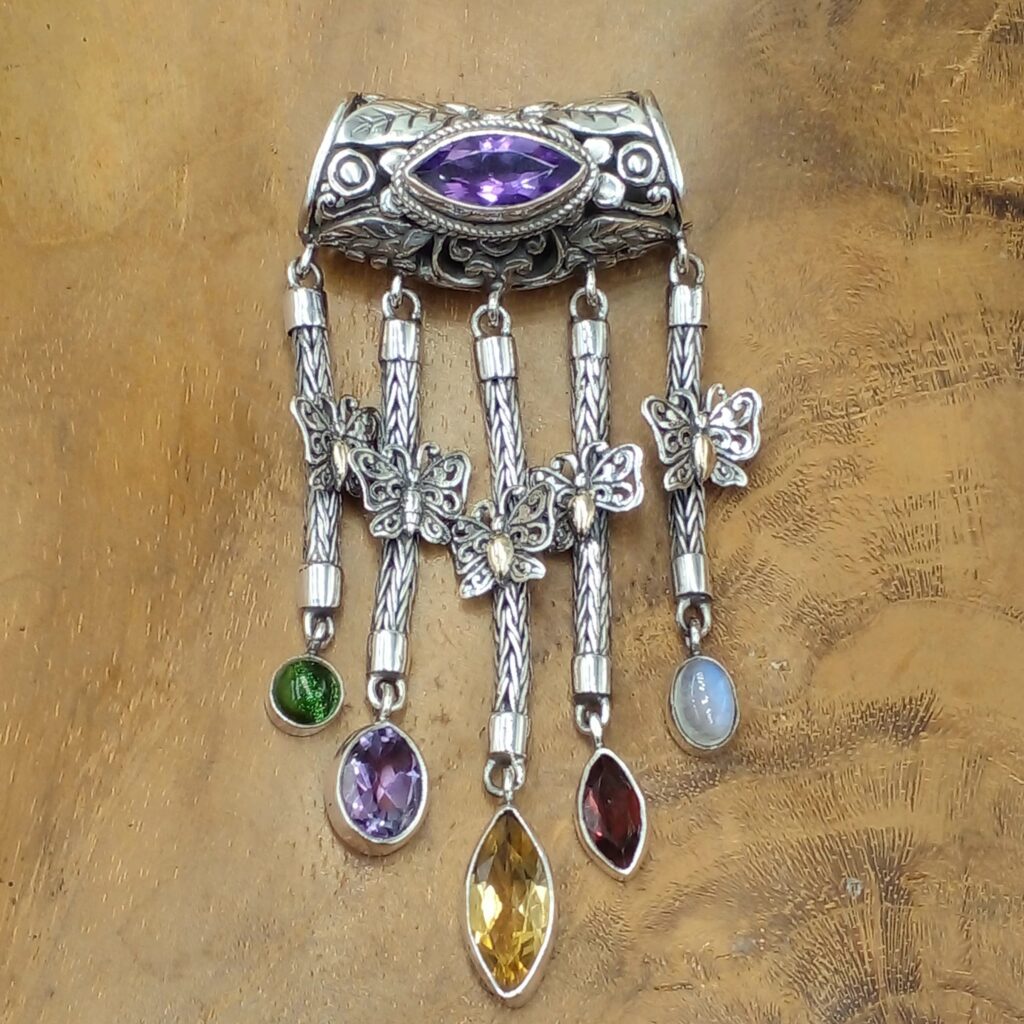 Spesifikasi Produk:Metal: Perak 92.5%Permata: Amethyst, Citrine, Garnet, Green Stone, MoonstoneEmas: 18KPanjang: 66 mmLebar: 35 mmBerat: 17.3 gr