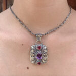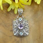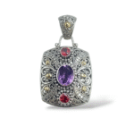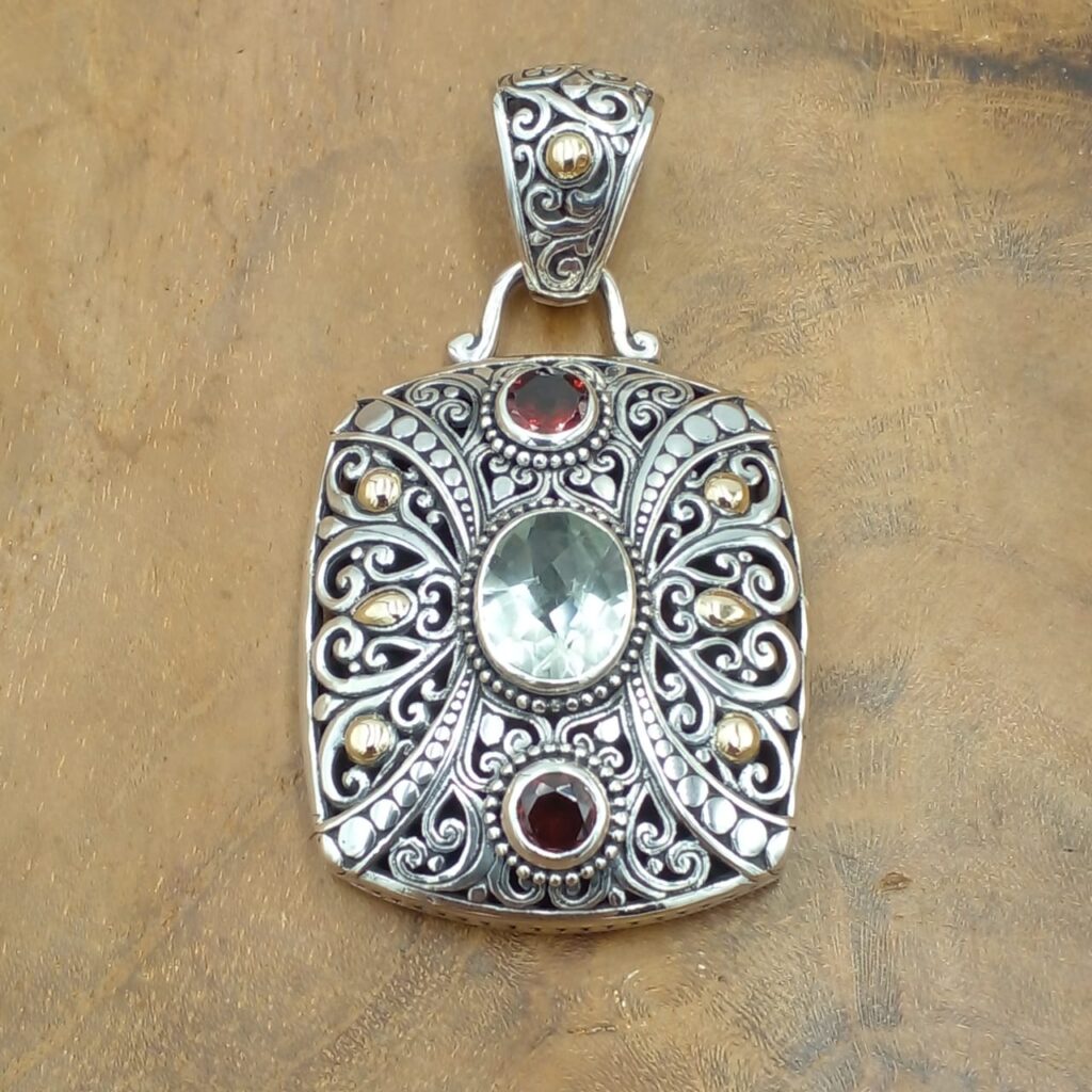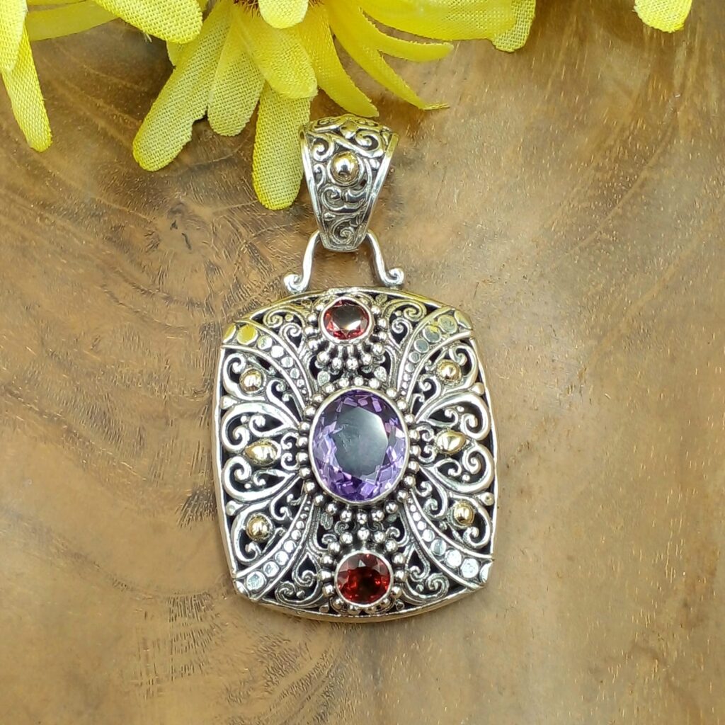 Spesifikasi Produk:Metal: Perak 92.5%Emas: 18KPermata: Amethyst, Citrine (Ov, 7×9)/ Amethyst, Green Amethyst (Ov, 8×10)/ Amethyst Cushion & Amethyst, Blue Topaz,Garnet (Rd, 5 mm)Panjang: 51 mmLebar: 28 mmBerat: 15.6 gr
