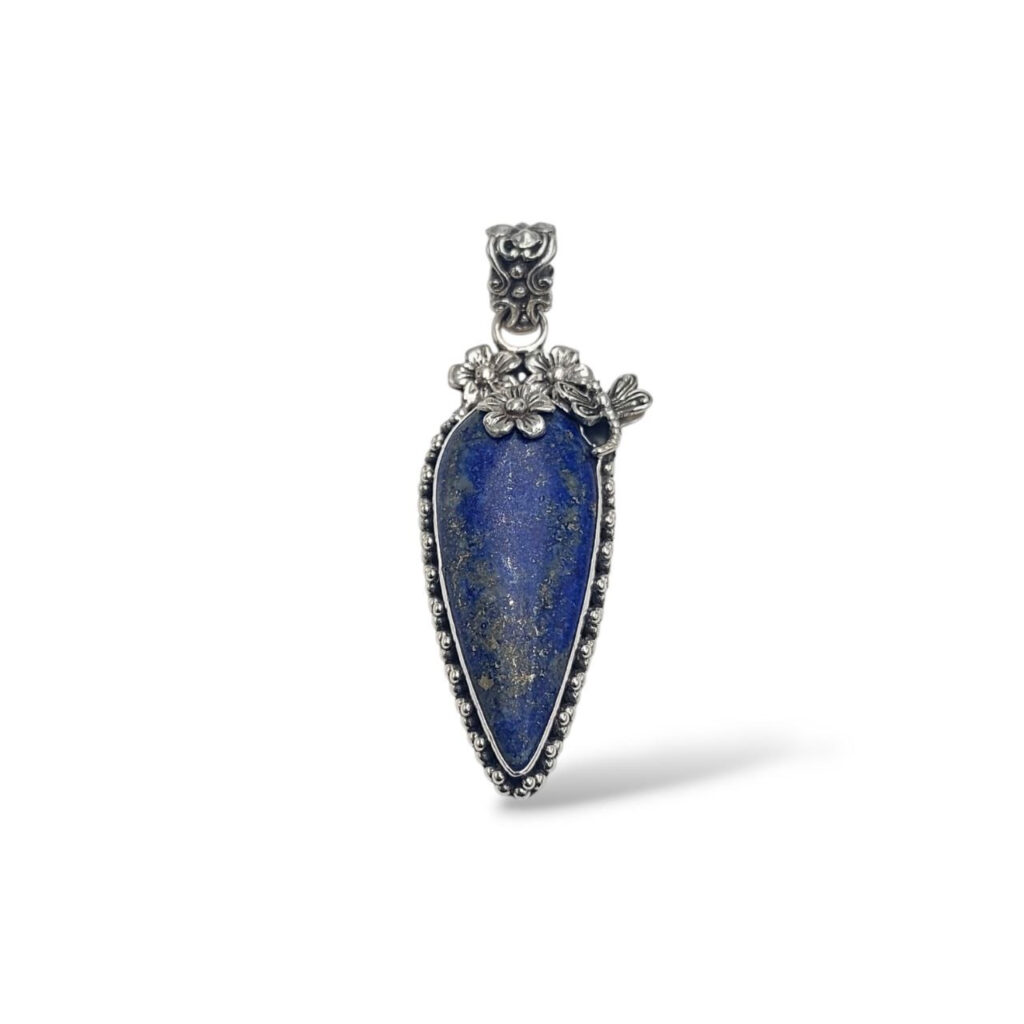 Liontin Perak Bali Permata merupakan perpaduan sempurna antara keanggunan dan keahlian tradisional Bali. Liontin ini terbuat dari perak murni 925 yang dikombinasikan dengan permata pilihan dan dibingkai dengan susunan jawan perak yang menciptakan tampilan yang elegan dan artistik. Sentuhan ukiran khas Bali pada gantungan (bail) liontin, tiga buah bunga perak dan seekor capung yang cantik menambah kesan eksotis dan alami.