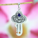 Temukan makna tersembunyi dalam keindahan Liontin Perak Kunci Bali – simbol dari harapan, pembuka jalan, dan perlindungan. Liontin ini didesain menyerupai bentuk kunci klasik, dipadukan dengan ukiran perak khas Bali yang kaya detail dan nilai budaya serta dihias dengan permata Lapiz Lazuli yang berkilau indah.