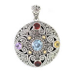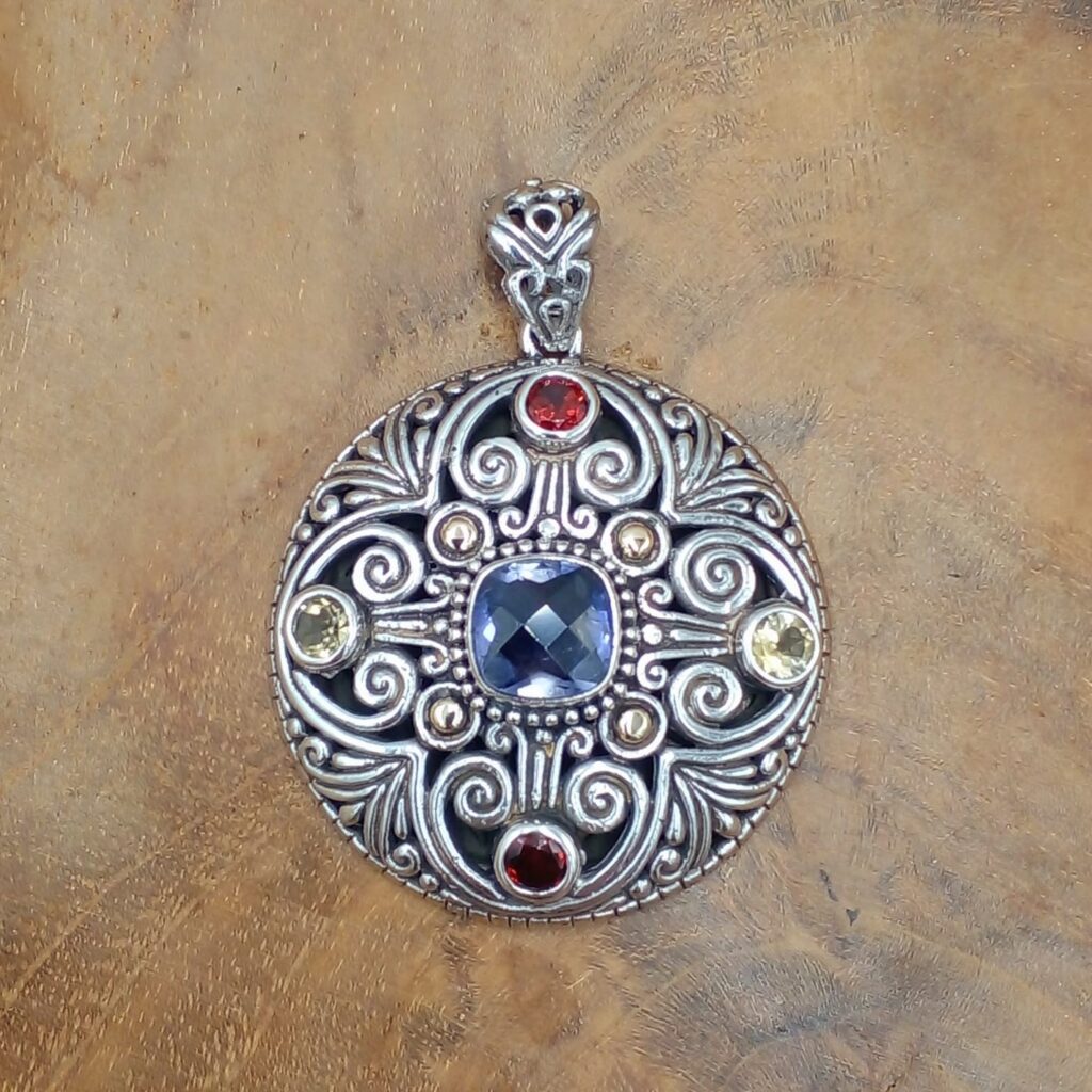 Spesifikasi Produk:Metal: Perak 92.5%Permata: Blue Topaz/ Citrine (RD, 7 mm)/ Tanzanite (CH, 8 mm ) & Amethyst, Citrine, Garnet (Rd, 4 mm)Emas: 18KPanjang: 45 mmLebar: 33 mmBerat: 17 gr