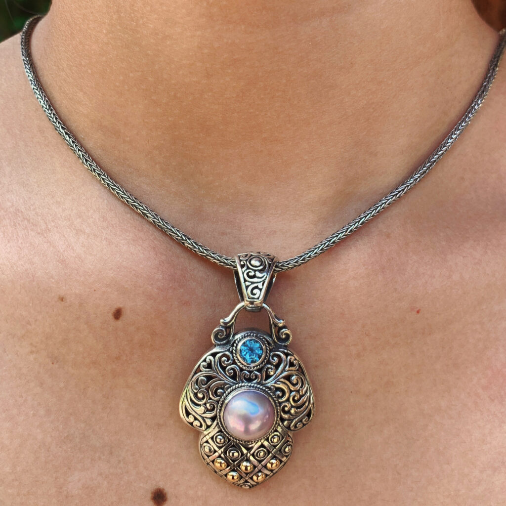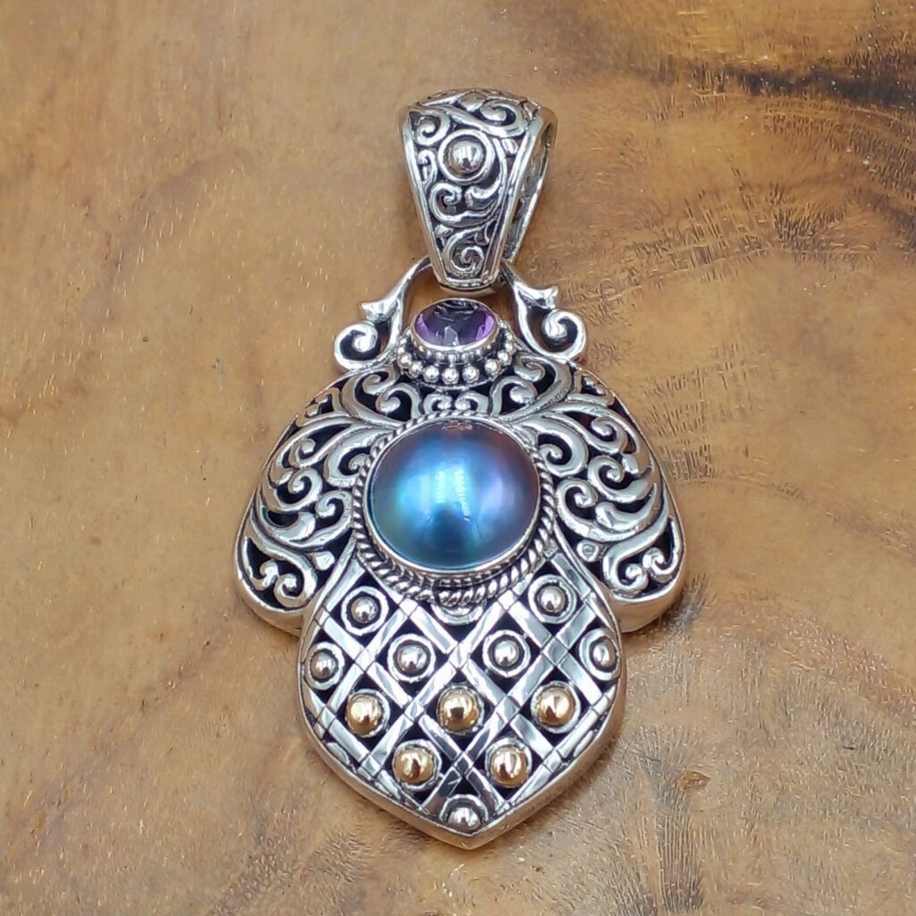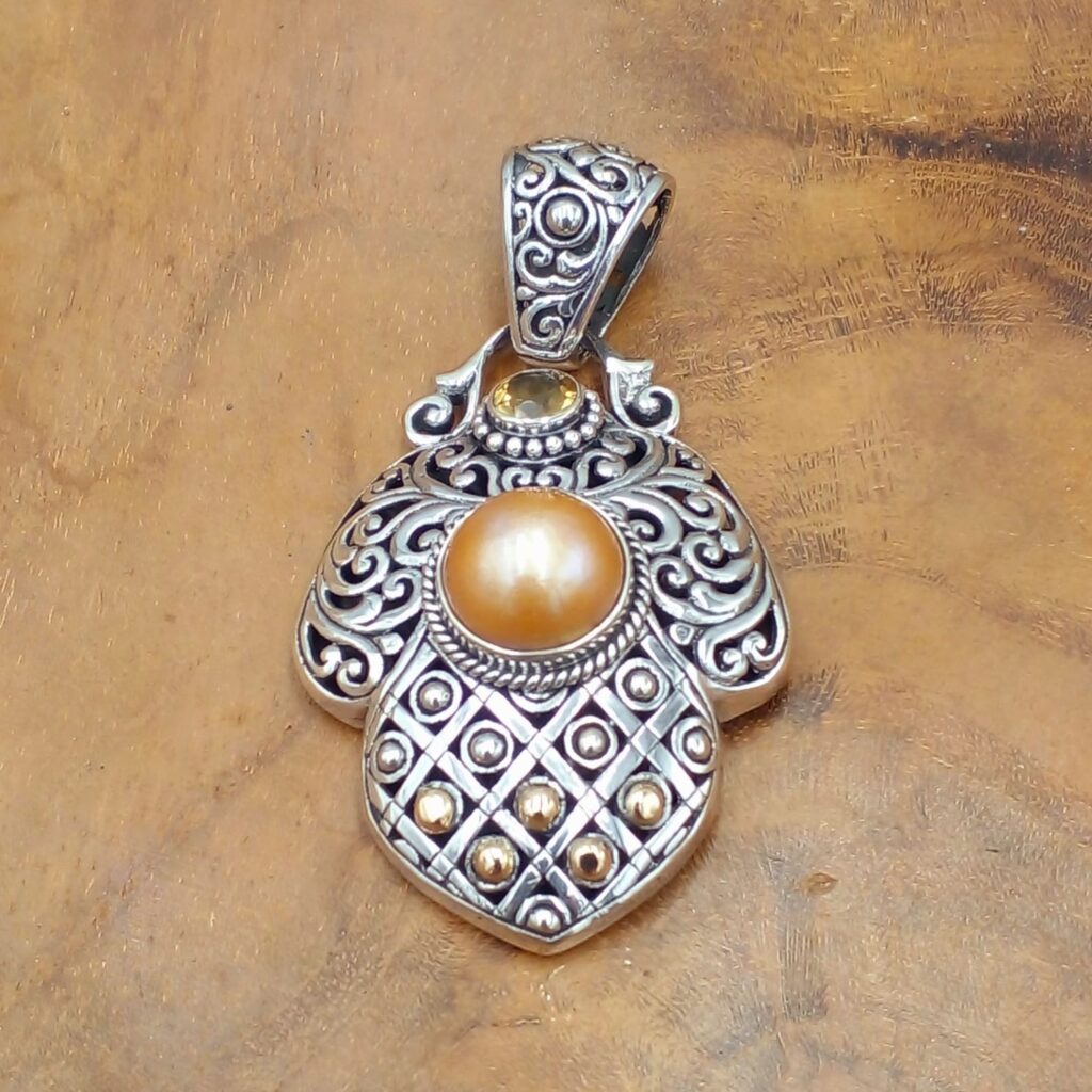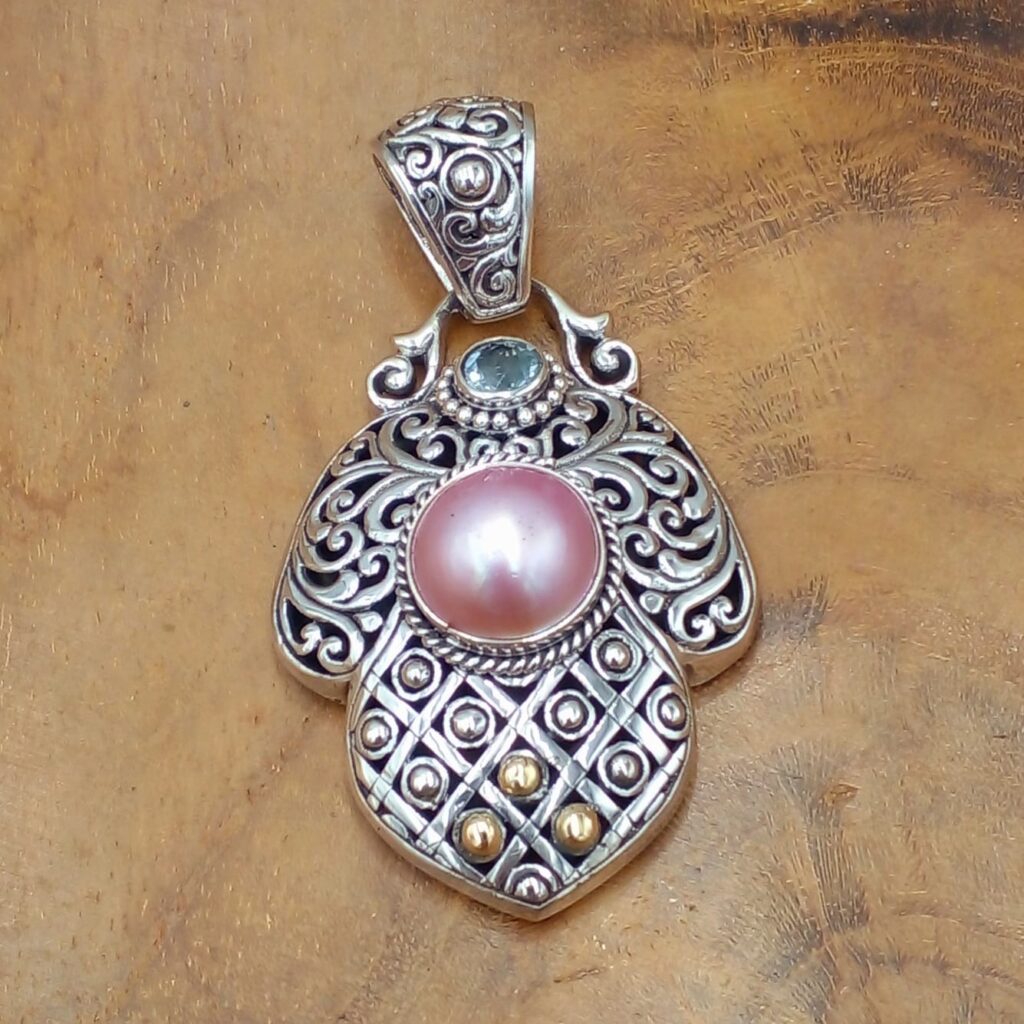 Liontin Perak Mutiara Mabe.Tampilkan kesan elegan dan unik dengan liontin perak mutiara Mabe yang terinspirasi dari bentuk perisai. Terbuat dari perak murni yang dipoles halus dengan ukiran khas Bali yang memikat. Liontin ini dihiasi oleh mutiara Mabe berkualitas tinggi dan emas 18 karat yang memancarkan kilau alami. Desain perisai yang kokoh melambangkan perlindungan dan kekuatan, cocok bagi Anda yang ingin tampil percaya diri namun tetap anggun.