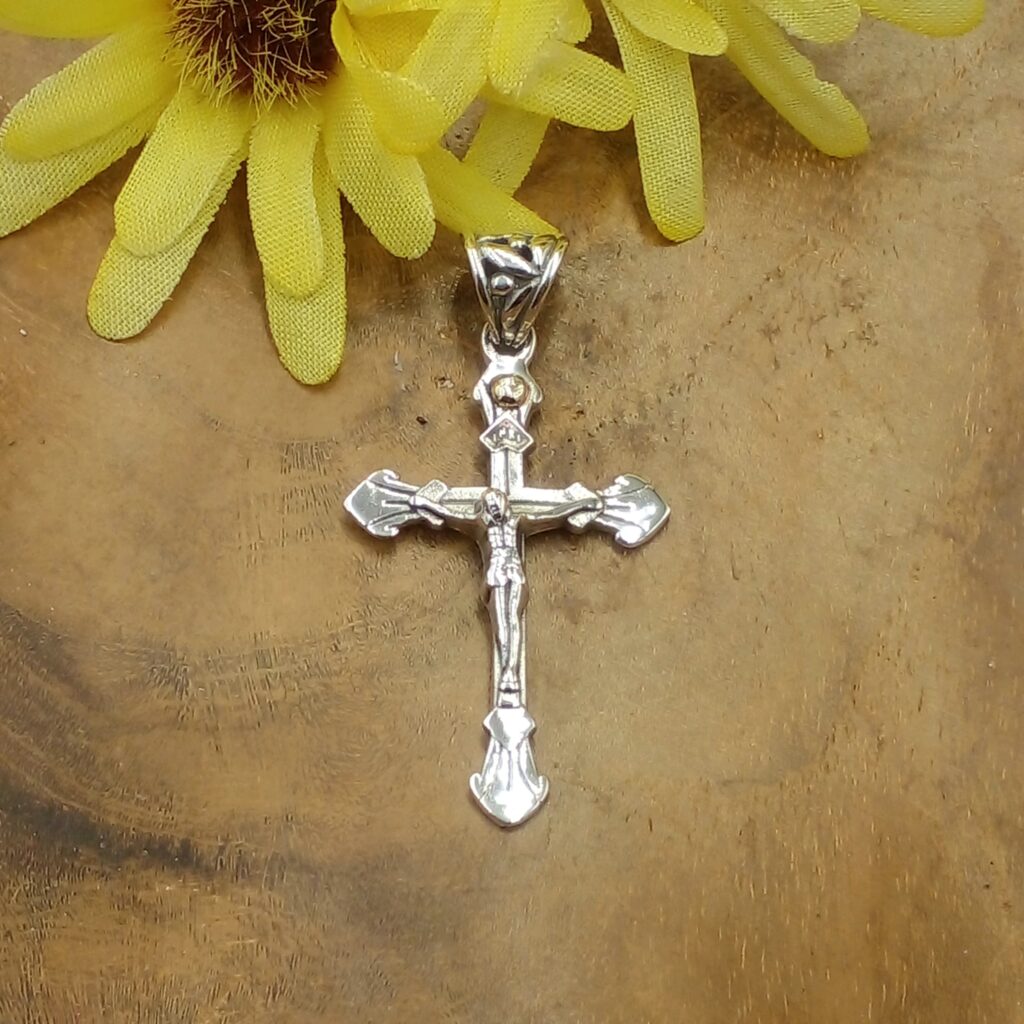 Liontin Perak Salib dengan Emas ini menghadirkan perpaduan artistik antara perak berkilau dan aksen emas yang menambah kesan mewah serta sakral. Dengan desain salib yang detail—termasuk figur tubuh Kristus dan ujung salib yang berbentuk ornamen klasik—liontin ini menjadi simbol iman yang kuat sekaligus aksesori elegan untuk penggunaan sehari-hari maupun acara khusus.
