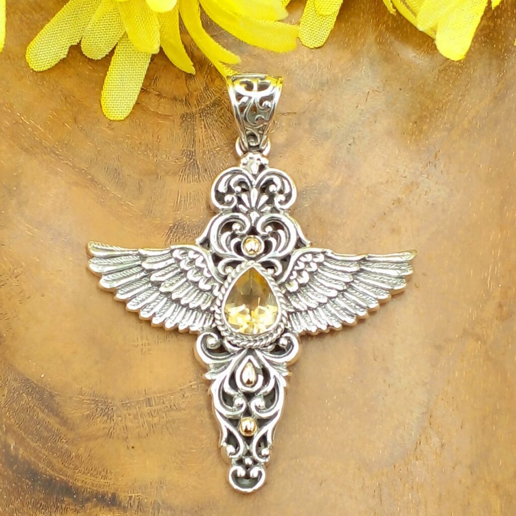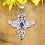 Spesifikasi Produk:Metal: Perak 92.5%Permata: Amethyst (Ps, 10×13 mm), Citrine (Ps, 8×10 mm)Emas: 18KPanjang: 62 mmLebar: 48 mmBerat: 16 gr